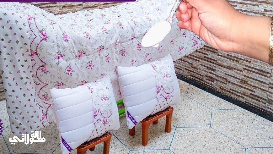 يجب عليك سيدتي أن تقومي اولا باختيار يوم مشمس قبل الشروع في الغسيل، ثم قومي بطي المفارش المنفوخة التي ترغبين في الحفاظ على شكلها والطي يجب أن يكون مربعا أو مستطيلا بحجم صغير ثم ثم ضعي مع المفرش كرات التنس الخضراء يفضل أن تضعي 3 أو 4 ثم شغلي الغسالة واتركيه مدة 30 دقيقة بعدها أزيليه بطريقة سلسلة وغيري المياه وضعي مياه نظيفة في حالة كانت الغسالة عادية من اجل ازالة الرواسب منه أما إذا كانت اوتوماتيك فازيليه وضعيه تحت اشعة الشمس سيكون على شكله ولن يتغير.