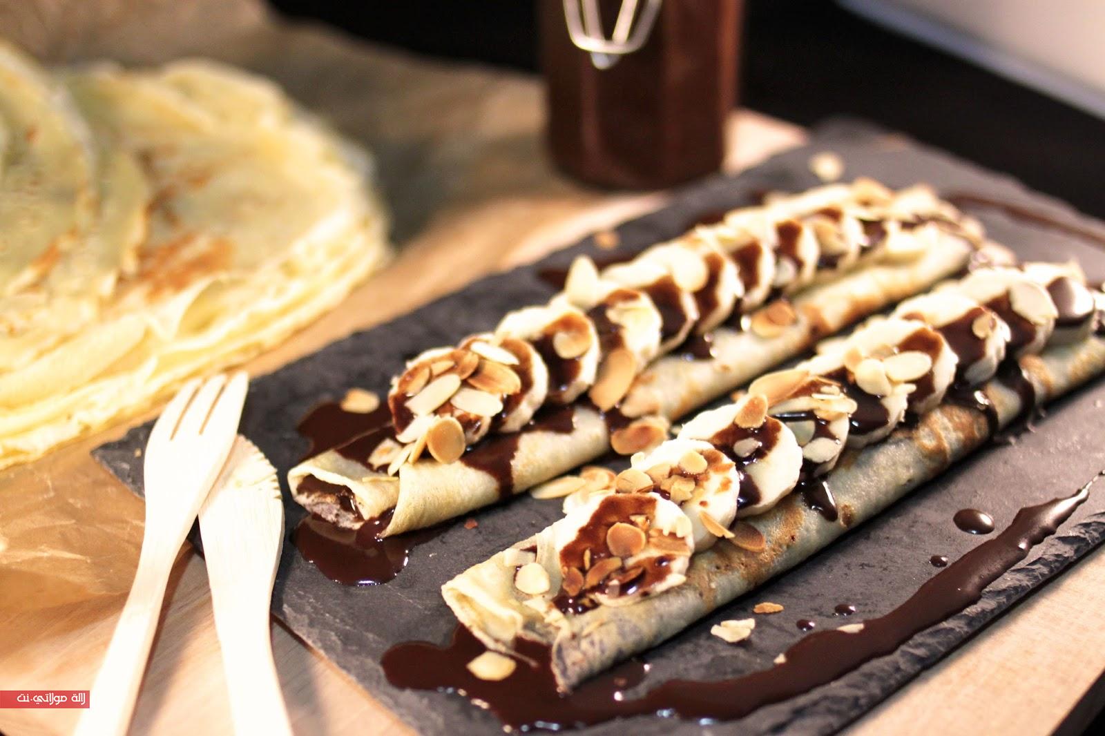 ثم نحشو الفطائر بالموز و الشكلاطة و تزين برقائق اللوز.شهية طيبة.