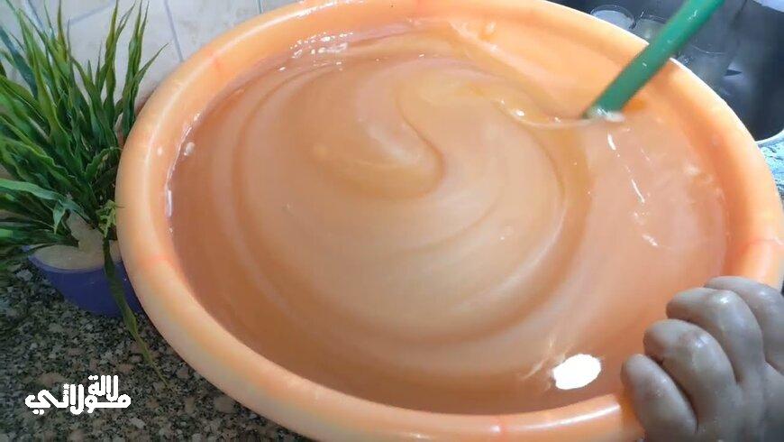 وبعدها سنجده مثل العجين وفي المرحلة الثانية سنقوم بعجنه ثانية بالماء البارد ( حوالي 3 لترات )