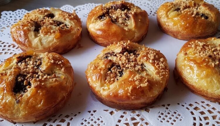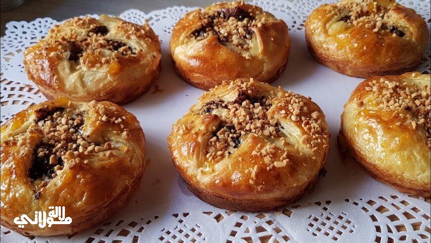 المكونات نصف كاس حليب نصف كاس ماء ملعقة كبيرة زيت ملعقة كبيرة سكر ملعقة متوسطة خميرة الخبز 4 غ خميرة الحلويات ملح 3 كؤوس دقيق ابيض الحشو شوكولا سوداء للتوريق زيت زبدة لينة للتزيين صفار بيضة مربى كاوكاو محمر.