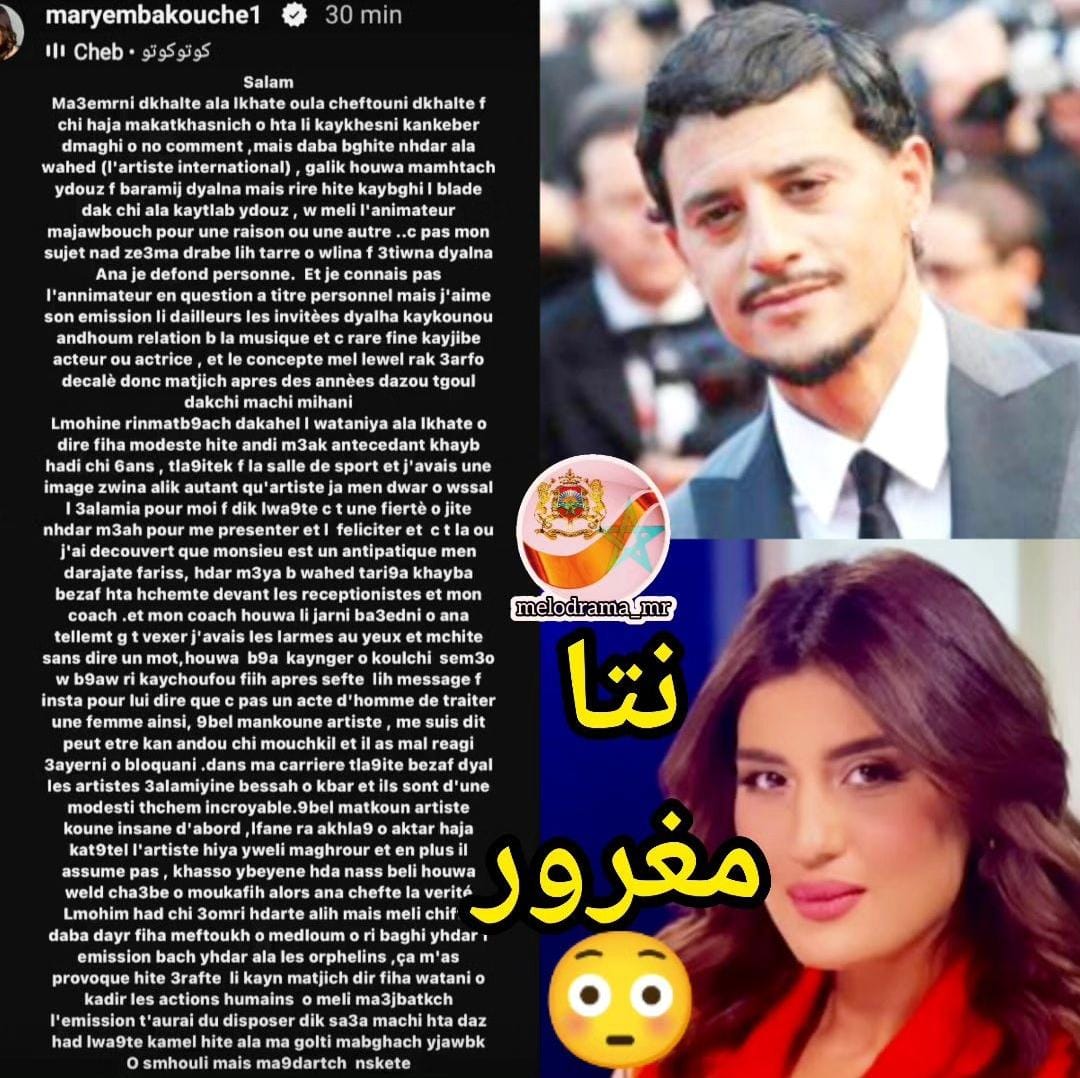 دخلت الفنانة مريم باكوش على خطة الخلاف الناشئ بين الفنان العالمي سعيد التغماوي والمنشط محمد بوصفيحة الملقلب بت” مومو”.