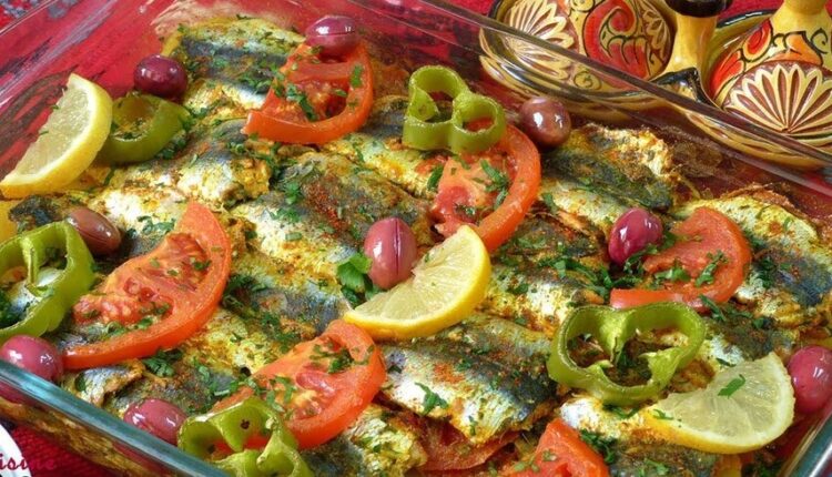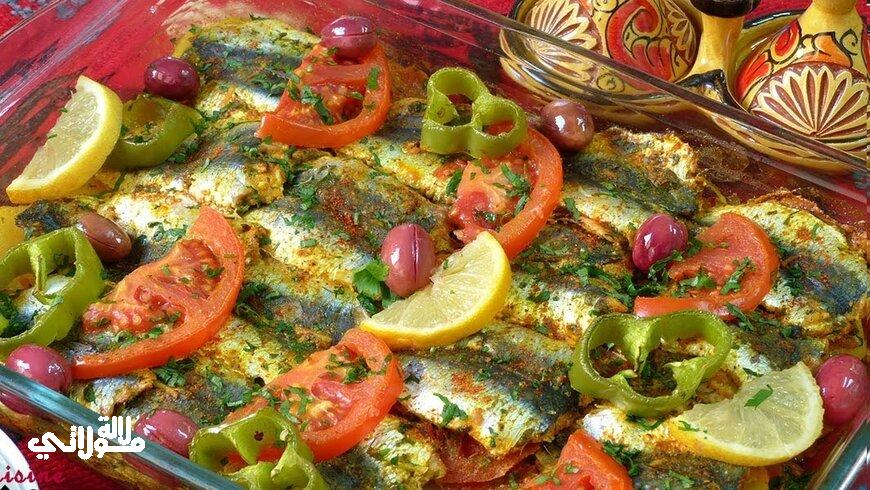 طريقة التحضير تُغسل الخضراوات، وتُقطع بصورة حلقات دائرية غليظة باستثناء الفلفل الأخضر الحار والكرفس. يُفتح السردين من المنتصف، ويُنظف جيدًا. تُحضر الشرمولة عن طريق خلط كافة المكونات معًا. يُدهن السردين من الخارج والداخل بالشرمولة. يُدهن الطاجين بزيت الزيتون. توضع نصف كمية السردين داخل الطاجين. تُضاف الخضار باستثناء الليمون، ثم يُضاف ما تبقى من السردين، يليه الليمون، وما تبقى من الشرمولة، والفلفل الحار، ثم يُضاف الماء، ويُغطى الطاجين. يُدخل الطاجين إلى الفرن، ويُترك مدة خمس وأربعين دقيقة، ثم يُقدم.