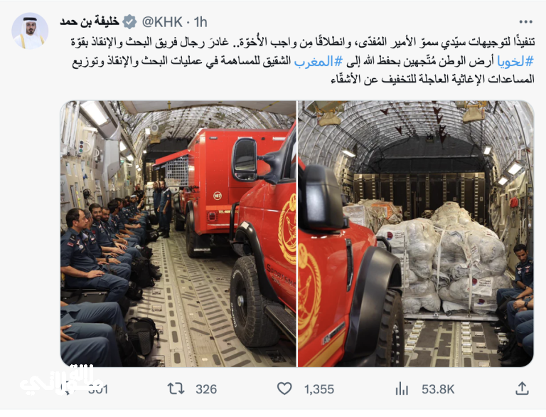 تنفيذًا لتوجيهات سيّدي سموّ الأمير المُفدّى، وانطلاقًا مِن واجب الأُخوّة.. غادرَ رجال فريق البحث والإنقاذ بقوّة #لخويا أرض الوطن مُتّجهين بحفظ الله إلى #المغرب الشقيق للمساهمة في عمليات البحث والإنقاذ وتوزيع المساعدات الإغاثية العاجلة للتخفيف عن الأشقّاء.
