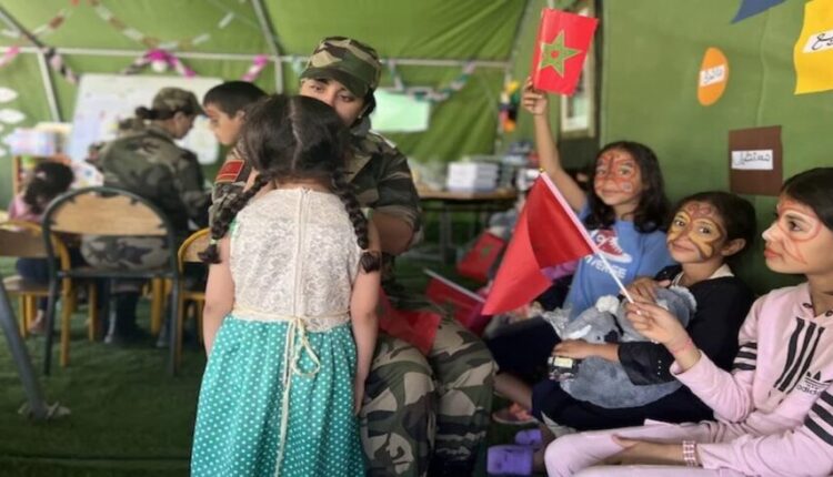الأمر يتعلق فعلا بخيمة عسكرية، غير أنها مؤثثة بمزلقة للأطفال ودور صغيرة وألعاب ورسومات ذات ألوان مختلفة، وبداخلها أطفال من مختلف الأعمار يستمتعون باللهو تحت إشراف مساعدات اجتماعيات من القوات المسلحة الملكية.
