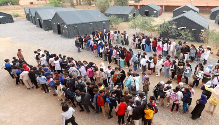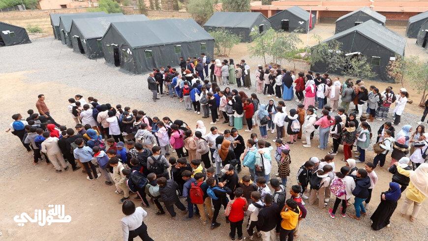 فبعزيمة قوية على بدء الموسم الدراسي بتفاؤل وتصميم للتغلب على آثار هذه الكارثة الطبيعية، توجه التلاميذ منذ الساعات الأولى إلى الخيام التي نصبتها القوات المسلحة الملكية بالقرب من الثانوية الإعدادية الفارابي بأمزميز، في انتظار إحداث وحدات المدارس المتنقلة. وبغية تمكين التلاميذ من مواصلة دراستهم في أفضل الظروف، تم بإقليم الحوز نصب 150 خيمة مجهزة بجميع المعدات التعليمية والتكوينية اللازمة بالإضافة إلى ألواح شمسية.