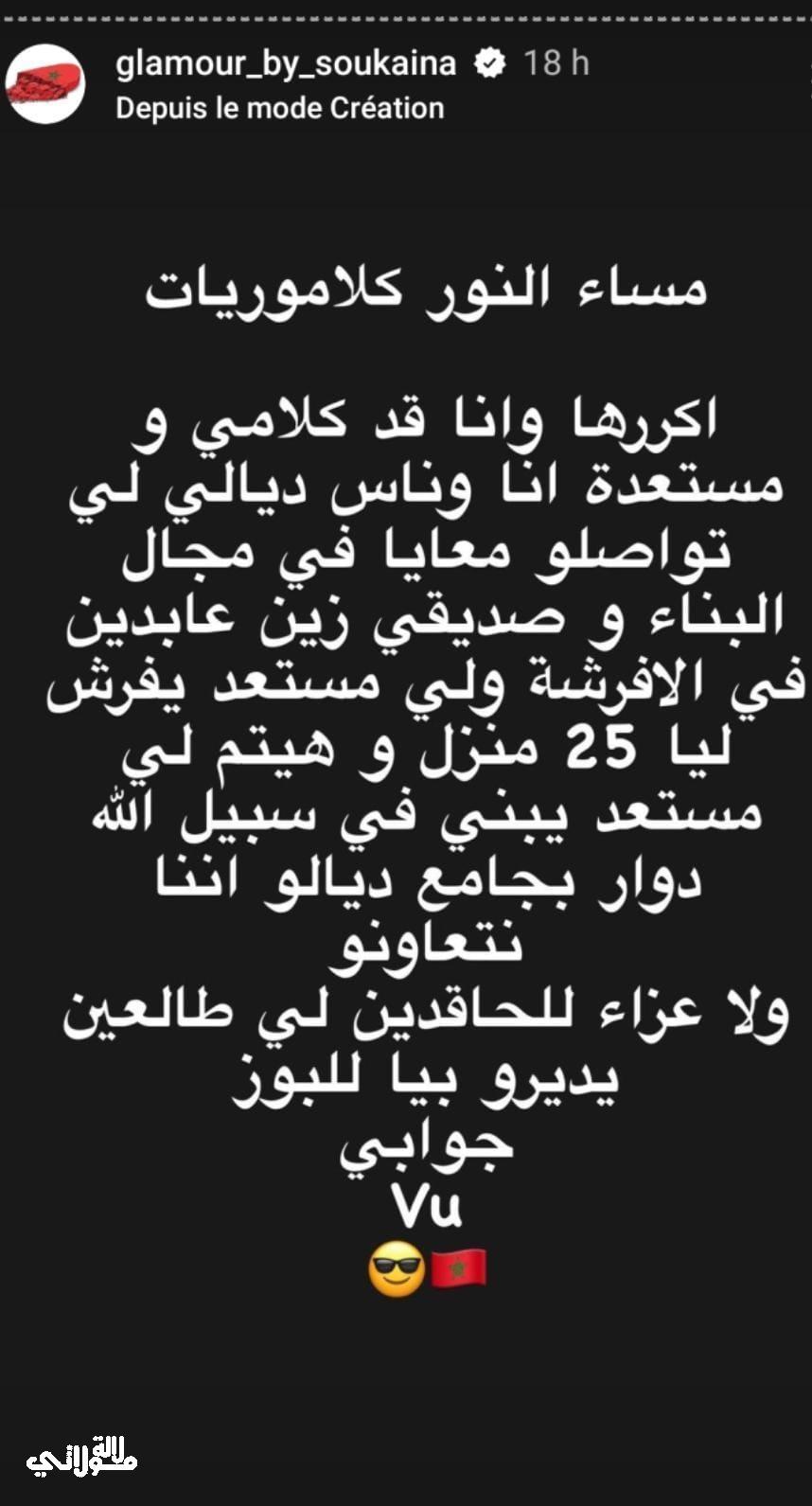 وعبرت سكينة عن استعدادها للقيام بهذه الخطوة بكل حب عبر حسابها الرسمي على موقع تبادل الصور والفيديوهات انستغرام، وخاصة عبر خاصية القصص القصيرة، حيث نشرت تدوينة قالت من خلالها:”أكررها وأنا قد كلامي ومستعدة أنا وناس ديالي لي تواصلو معايا في مجال البناء، وصديقي زين الدين في الأفرشة ولي مستعد يفرش ليا 25 منزل وهيتم لي مستعد يبني في سبيل الله دوار بجامع ديالو اننا نتعاونو”.