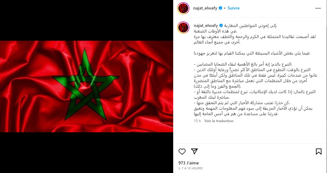 وكتبت نجاة الوافي في تدوينة تقول:”إلى إخوتي المواطنين المغاربة، في هذه الأوقات الصعبة، لقد أصبحت تقاليدنا المتمثلة في الكرم والرحمة واللطف معترف بها مرة أخرى في جميع أنحاء العالم”.