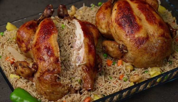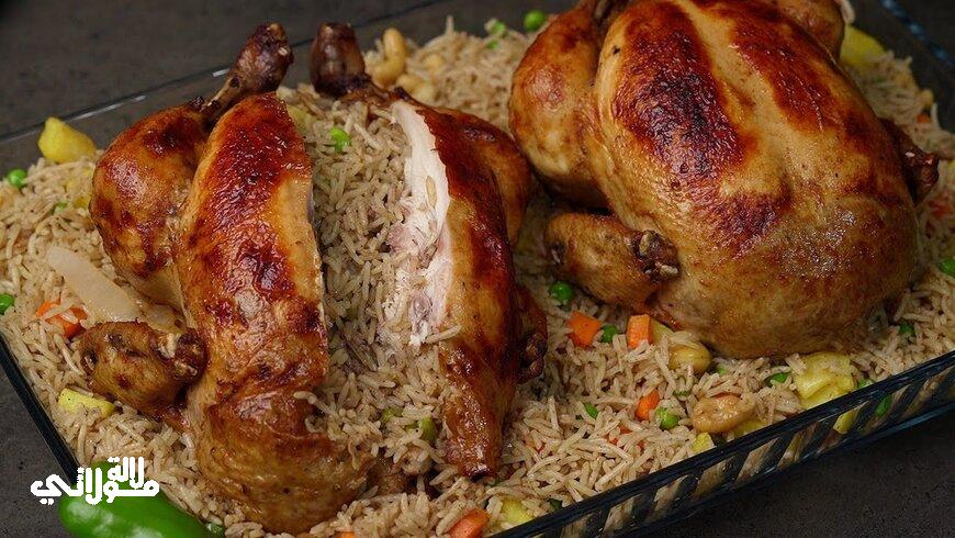 المكونات 1 بصلة مبشورة ناعم 2 طماطم مبشورة ناعم 4 ملعقة كبيرة زبادي 4 ملعقة كبيرة عصير ليمون ورق غار 3 ملعقة كبيرة زيت 1 ملعقة كبيرة بابريكا 1 وربع ملعقة كبيرة ملح نصف ملعقة صغيرة فلفل اسود 1 ملعقة كبيرة زعتر نصف كوب ماء 1 ملعقة كبيرة صويا صوص 2 دجاج متوسط الحجم مغسول جيدا 4 ملعقة كبيرة زيت 1 بصلة صغيرة مفرومة ناعم 1 ملعقة كبيرة سبع بهارات 1 وربع ملعقة كبيرة ملح نصف ملعقة كبيرة قرفة نصف ملعقة صغيرة هيل مطحون 3 كوب ارز بسمتي منقوع نصف ساعة 4 ونصف كوب ماء مغلي 1 بطاطس كبيرة مكعبات مقلية 2 جزر مكعبات صغيرة 1 كوب بازيلا مكسرات حسب الرغبة شرائح بصل لتبطين صينية الفرن اعواد خشبية للحشو والتثبيت نشوي الدجاج على حرارة 260 وهو مغطي مدة 70 دقيقة ثم نشيل الغطاء ونرجعة علر حرارة 180 مدة 30 دقيقة.