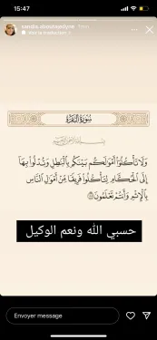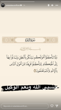 وكانت الآية القرآنية التي نشرها أبطال المسلسل تضمنت قوله تعالى: “وَلا تَأْكُلُوا أَمْوَالَكُمْ بَيْنَكُمْ بِالْبَاطِلِ وَتُدْلُوا بِهَا إِلَى الْحُكَّامِ لِتَأْكُلُوا فَرِيقًا مِنْ أَمْوَالِ النَّاسِ بِالإِثْمِ وَأَنْتُمْ تَعْلَمُونَ”، مع عبارة: “حسبي الله ونعم الوكيل”.