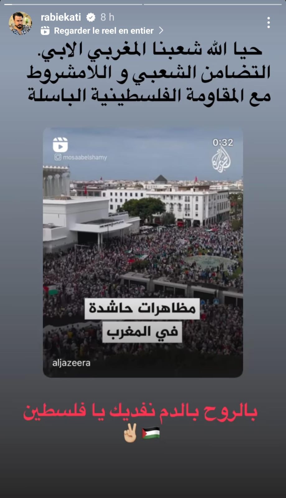 بعد الدعم الذي قدمه الفنان المغربي ربيع القاطي للقضية الفلسطينية والشعب الفلسطيني من خلال منشوراته الأخيرة عبر حسابه الرسمي على موقع تبادل الصور والفيديوهات إنستغرام، أشاد عدد من رواد مواقع التواصل بهذا الموقف له.