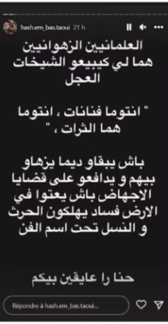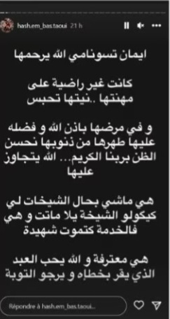 وأضاف هاشم البسطاوي قائلا في تدوينته عن الراحلة إيمان تسونامي قائلا: “هي ماشي بحال الشيخات لي كيكولو الشيخة يلا ماتت وهي فالخدمة كتموت شهيدة هي معترفة والله يحب العبد الذي يقر بخطئه ويرجو التوبة “.