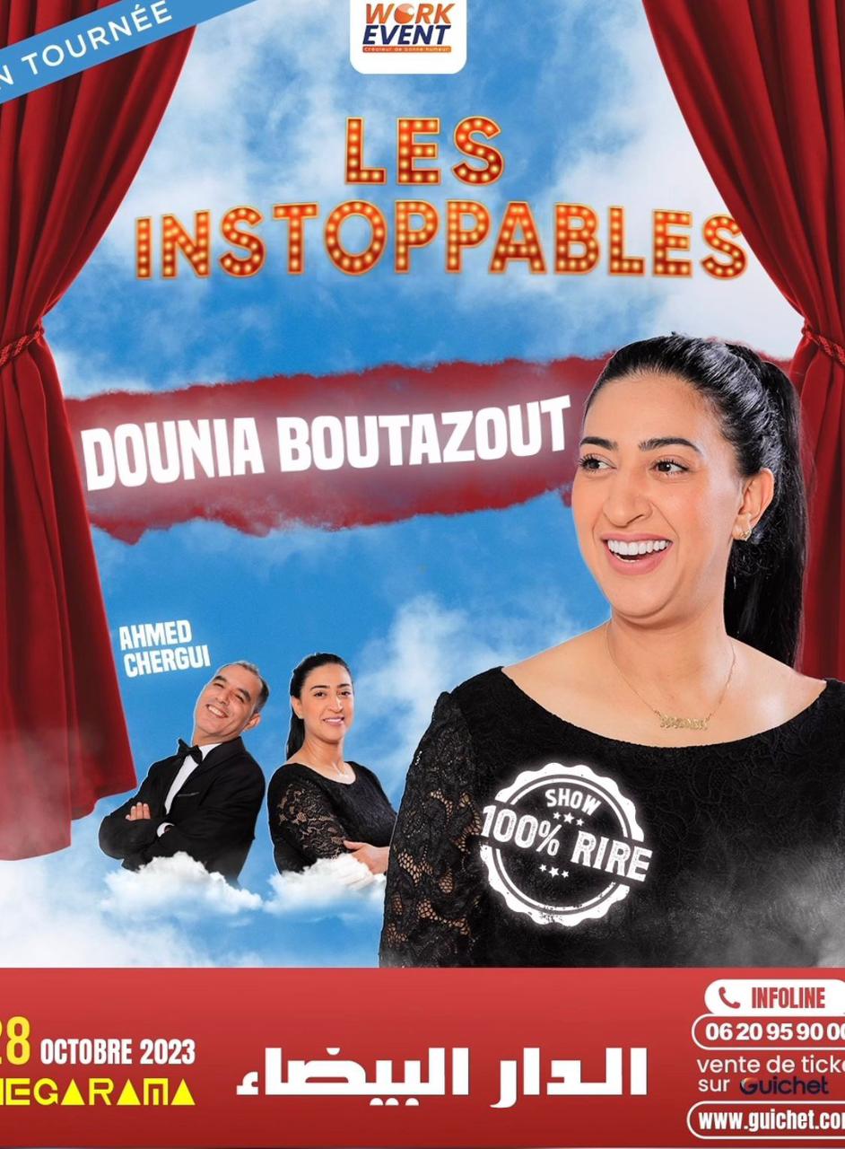تضرب الفنانة المغربية دنيا بوطازوت الموعد مع جمهورها على خشبة المسرح من خلال عرضها الكوميدي الجديد الذي يحمل عنوان “Les instoppables”، بمشاركة الكوميدي أحمد شركي، وذلك اليوم السبت 27 أكتوبر الجاري بسينما ميغاراما بالدارالبيضاء.