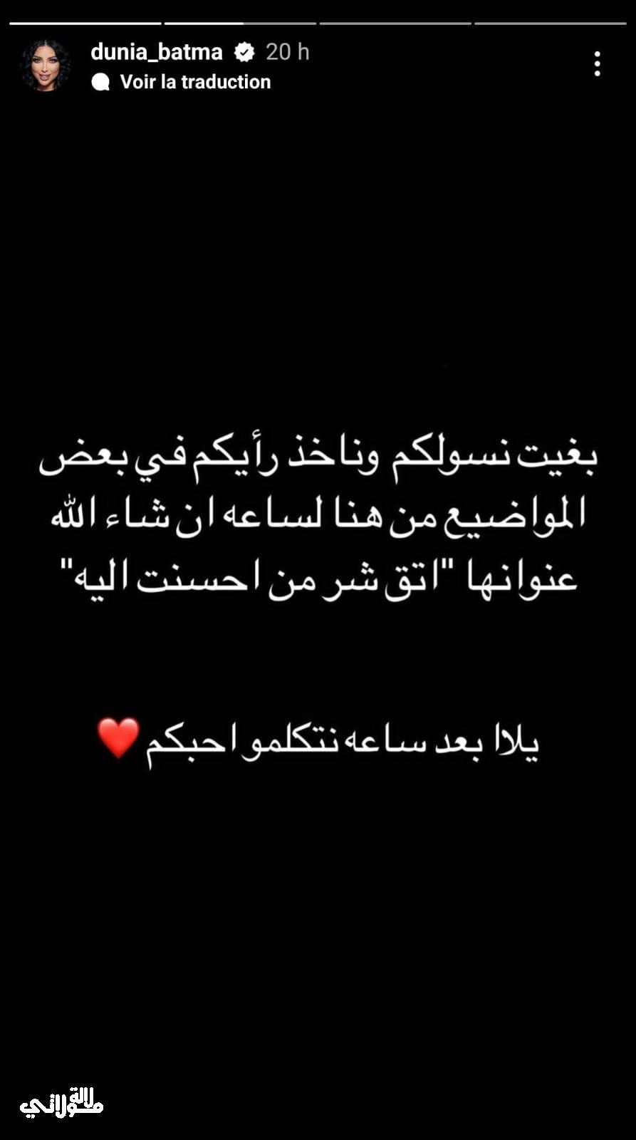 واختارت دنيا بطمة أن تشارك تدوينتها مع متابعيها عبر خاصية القصص القصيرة، والتي قالت من خلالها”بغيت نسولكم وناخد رأيكم في بعض المواضيع من هنا لساعة إن شاء الله عنوانها: “إتق شر من أحسنت إليه.”