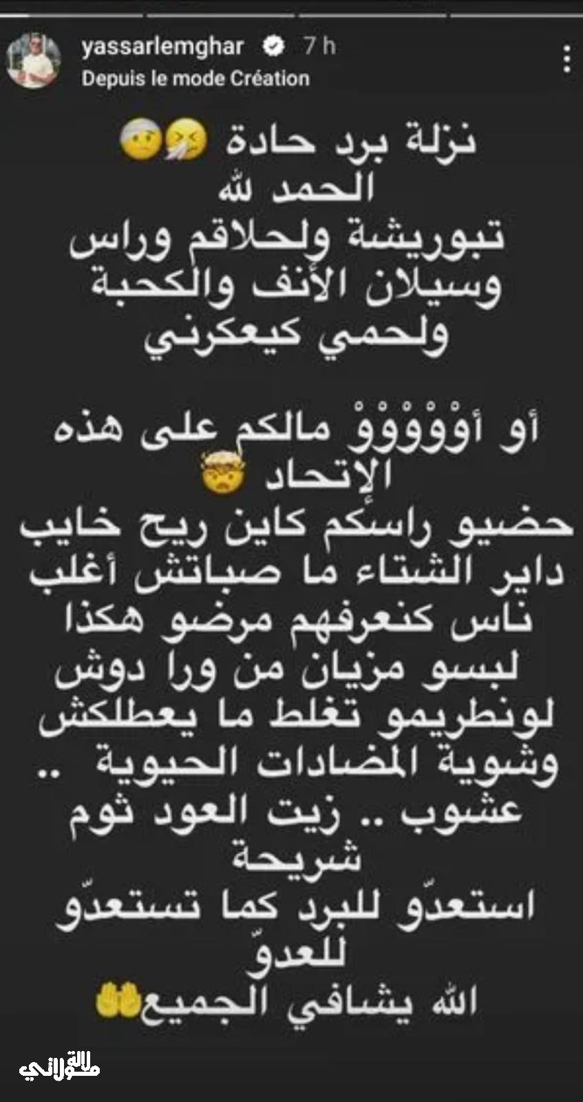 بسبب ما تشهده الأجواء من تقلبات في الفترة الحالية وجه الفنان الكوميدي يسار المغاري رسالة تحذيرية لمتابعيه وجمهوره عبر حسابه الرسمي على موقع تبادل الصور والفيديوهات إنستغرام وبالضبط عبر خاصية القصص القصيرة.