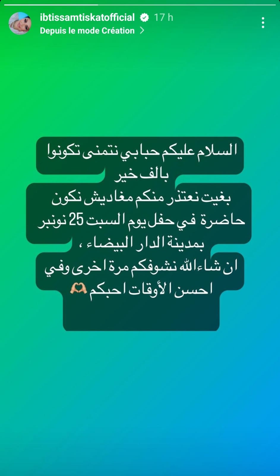 وكتبت ابتسام تسكت تدوينة نشرتها عبر خاصية القصص القصير قالت من خلالها:”السلام عليكم حبابي نتمنى تكونوا بألف خير، بغيت نعتذر منكم مغاديش نكون حاضرة في حفل يوم السبت 25 نونبر، بمدينة الدار البيضاء.
