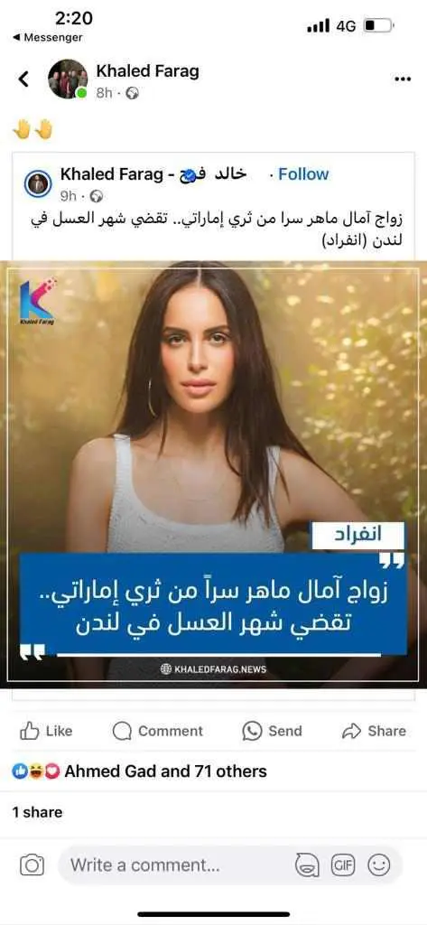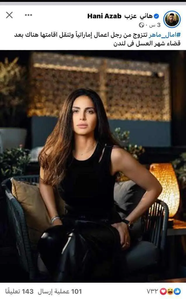 وفي السياق نفسه نشر الناقد والكاتب الصحفي خالد فرج عبر صفحته الرسمية على فيسبوك: “زواج آمال ماهر سرا من ثري إماراتي.. تقضي شهر العسل في لندن”.