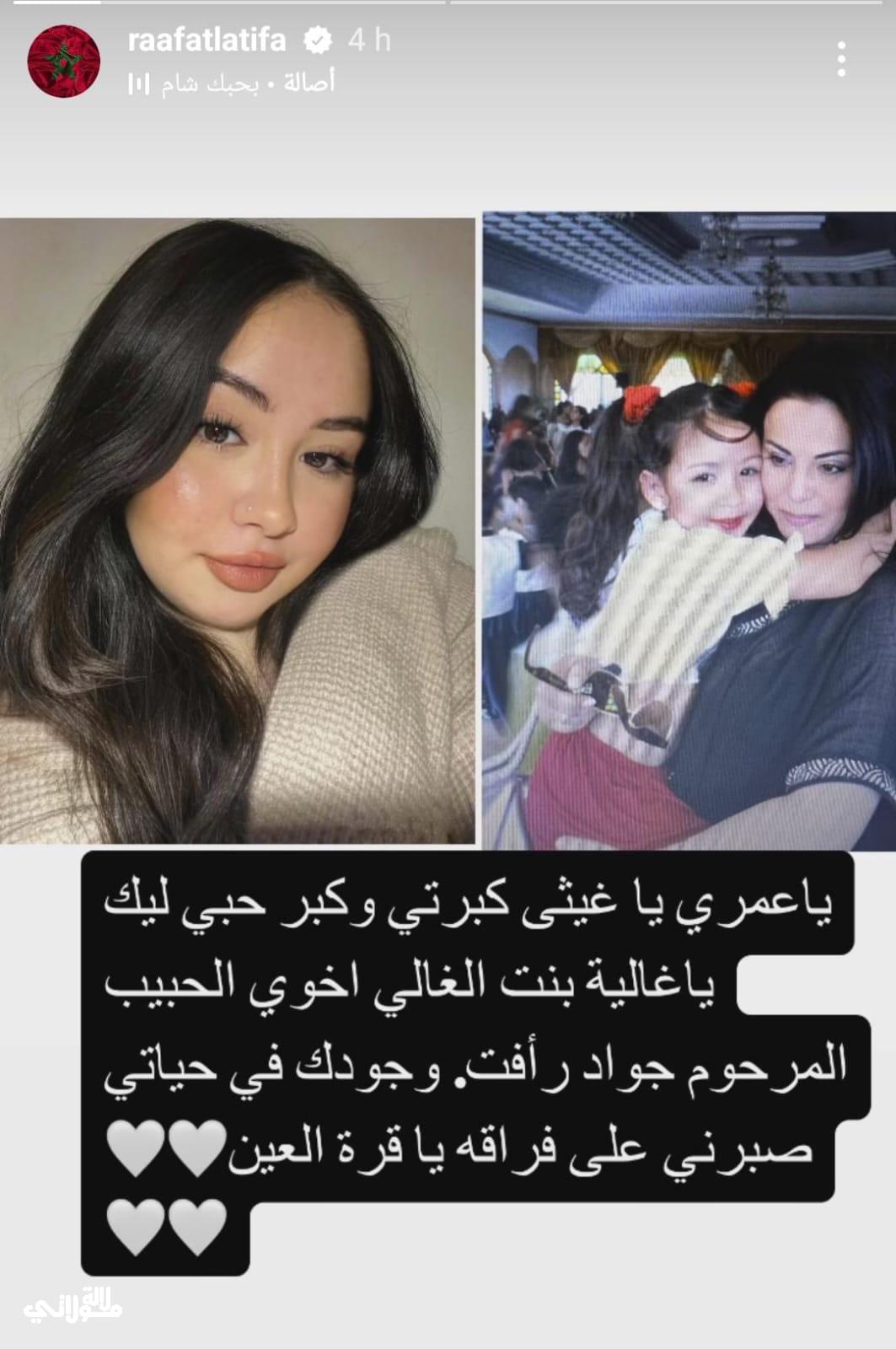 وكتبت لطيفة رأفت في تدوينتها أرفقتها بصورة تجمعها بابنة شقيقها والتي شاركتها عبر خاصية القصص القصيرة قائلة:” يا عمري غيثة كبرتي وكبر حبي ليك يا غالية بنت الغالي اخوي الحبيبة المرحوم جواد رأفت، وجودك في حياتي صبرني على فراقه يا قرة عيني.”