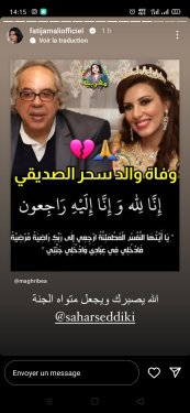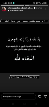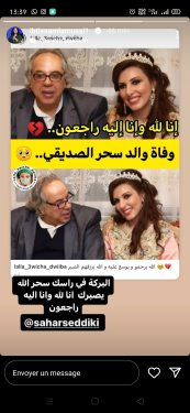 ومن بين الفنانات اللواتي كن سباقات في تعزية ومواساة سحر الصديقي كانت فاطمة الزهراء لحرش التي كتبت تدوينة تعزيها من خلالها ونشرتها عبر حسابها الرسمي على موقع تبادل الصور والفيديوهات إنستغرام.