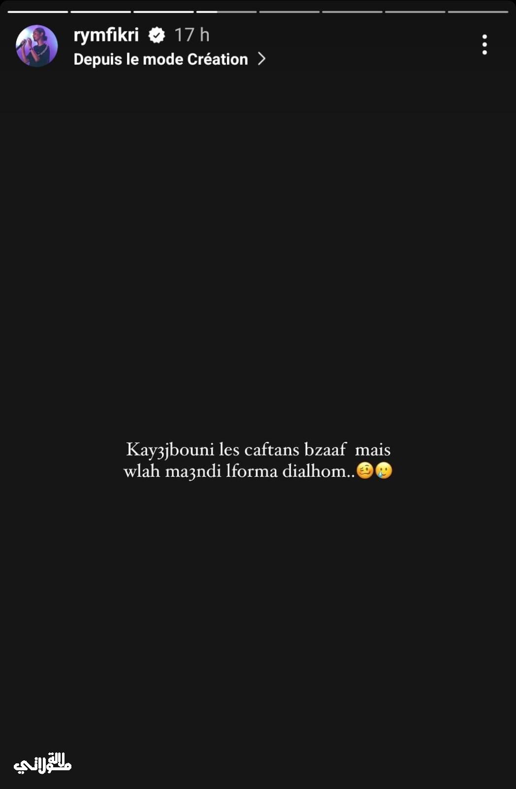 وفي رد منها على الانتقادات التي تعرضت لها بسبب لباسها وعدم اختيارها للقفطان المغربي من اجل الظهور به في مثل هذه الأحداث الكبيرة، حيث قالت في تدوينة لها عبر حسابها الرسمي على موقع تبادل الصور والفيديوهات إنستغرام وبالضبط على خاصية القصص القصيرة :” كيعجبوني القفاطن بزاف ولكن معنديش الفورما ديالهم.”