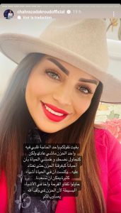 وكتبت شهرزاد تدوينة ارفقتها بصورة لها عبر خاصية القصص القصيرة قائلة: “بغيت نقولكم واحد الحاجة، قلبي فيه واحد الحزن ماشي عادي ولكن كنحاول نضحك وعلمتني الحياة بأن أحياناً كيغرقنا الحزن حتى نعتاد عليه”٠