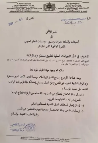 في هذا السياق، وجه المدير الإقليمي لمديرية التعليم باكادير إداوتنان، مراسلة إلى مديرات ومديري مؤسسات التعليم العمومي التابعة لنفس المديرية، في “شأن الإجراءات العملية لتطبيق مسطرة ترك الوظيفة”.