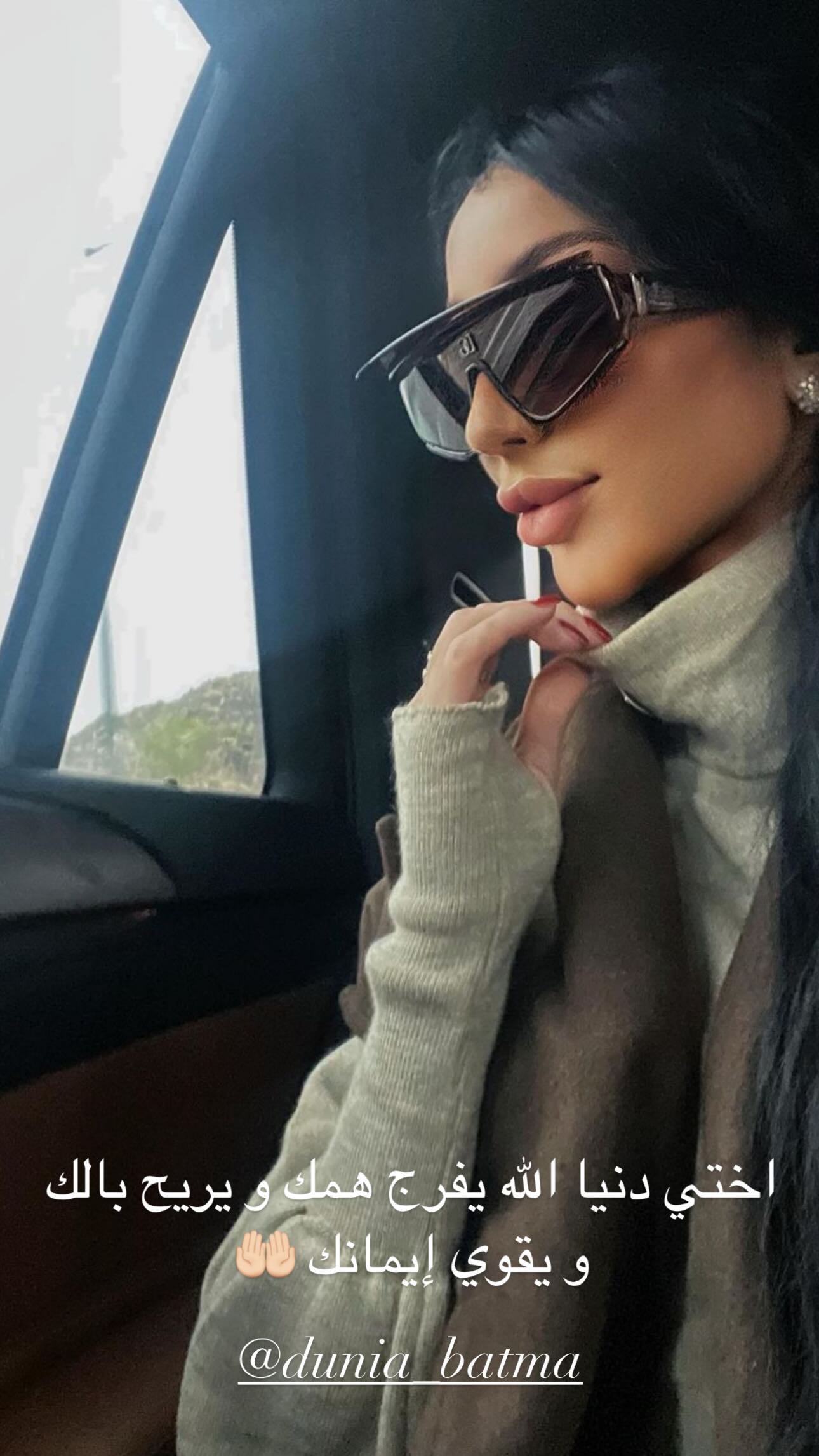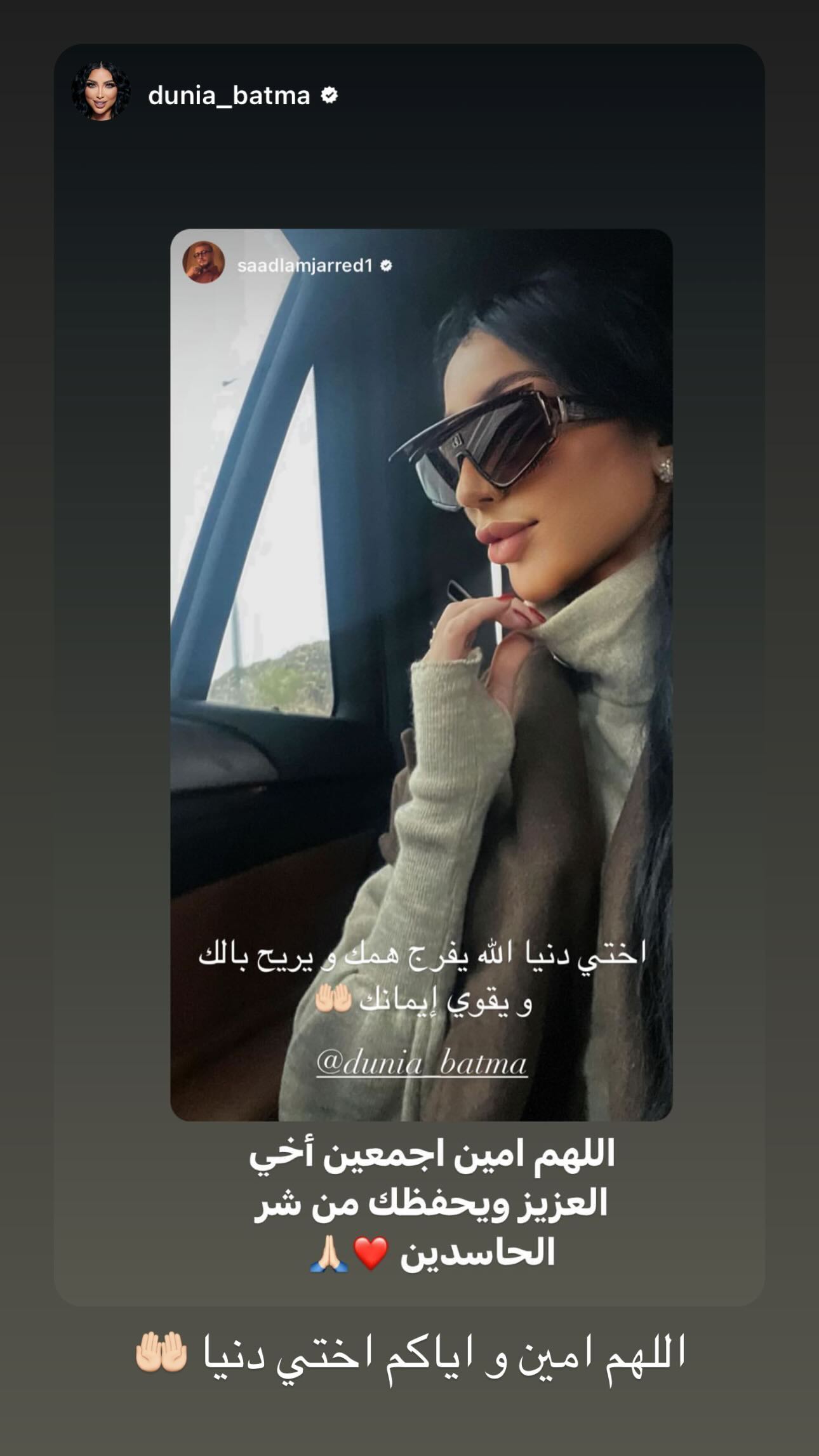 وردت دنيا بطمة على تدوينة سعد لمجرد بإعادة نشرها عبر حسابها الرسمي على أنستغرام، واختارت خاصية القصص القصيرة، حيث كتبت قائلة:”اللهم أمين أجمعين أخي العزيز ويحفظك من شر الحاسدين.”