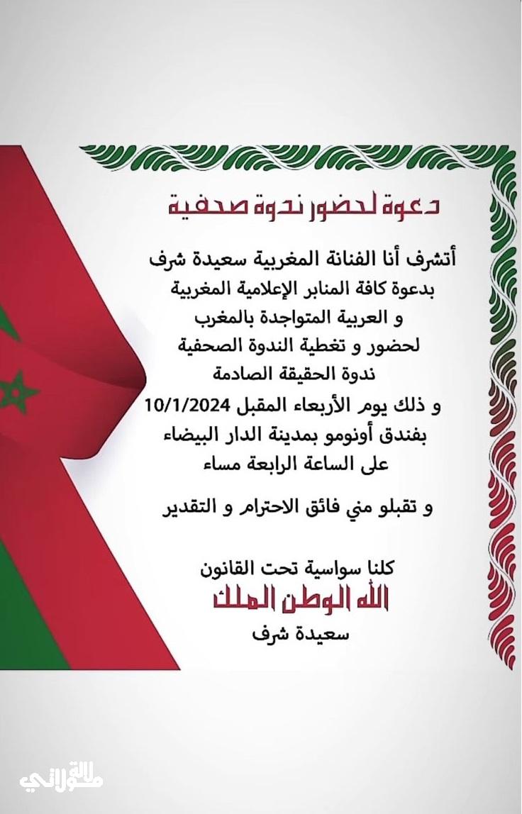 ونشرت سعيدة شرف الندوة عبر حسابها الرسمي على موقع تبادل الصور والفيديوهات إنستغرام، وبالضبط عبر خاصية القصص القصيرة وكتبت فيها قائلة:” أتشرف أنا الفنانة المغربية سعيدة شرف، بدعوة كافة المنابر الإعلامية المغربية والعربية المتواجدة بالمغرب، لحضور وتغطية الندوة الصحفية ندوة الحقيقة الصادمة، وذلك يوم الأربعاء المقبل 10/1/2024، بفندق أونومو بمدينة الدار البيضاء على الساعة الرابعة مساء”.