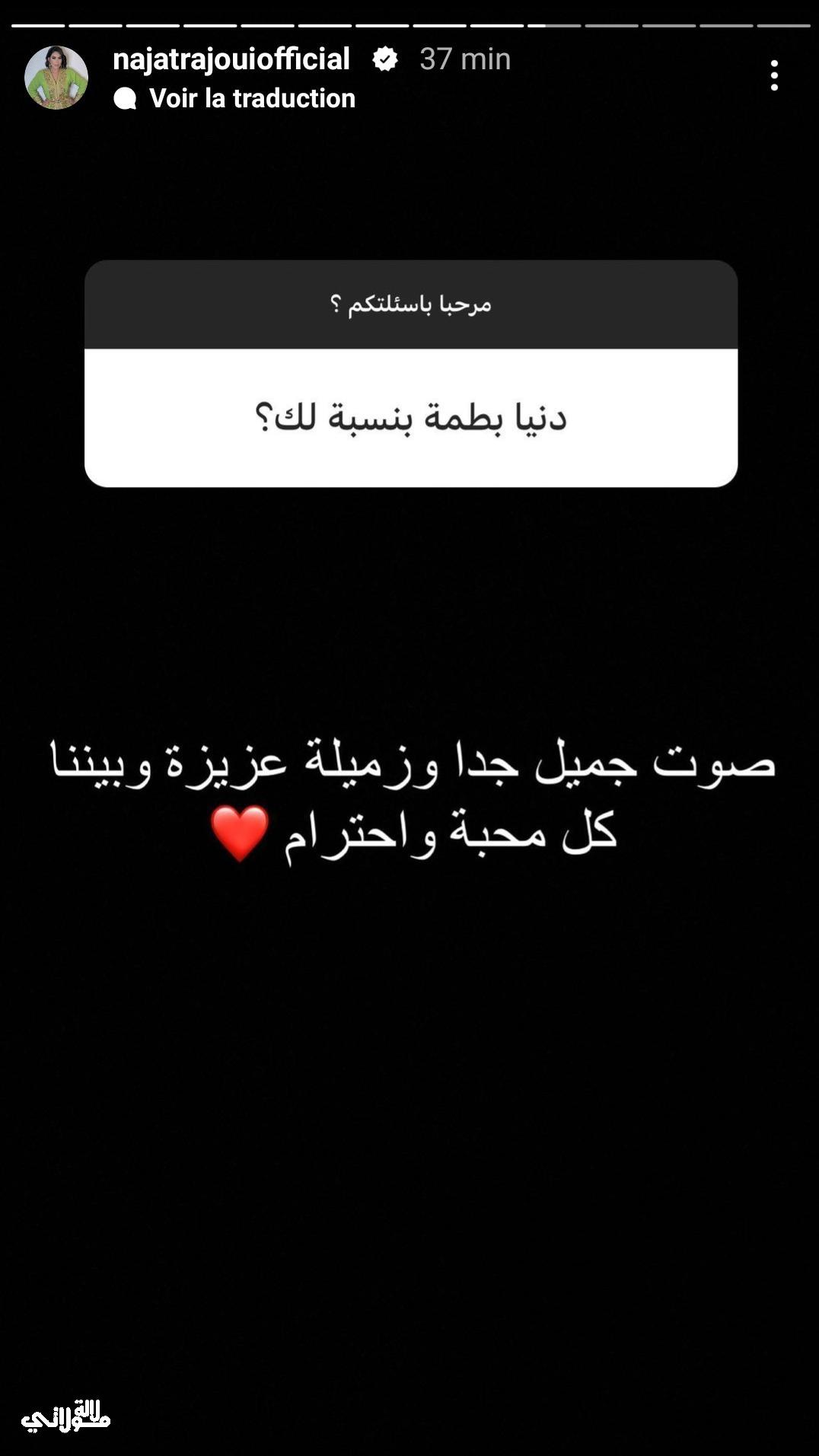 وفي ردها أكدت الفنانة نجاة الرجوي أنها تكن كل الحب والاحترام لدنيا بطمة وكتبت قائلة:”صوت جميل جدا وزميلة عزيزة وبيننا كل محبة واحترام.”