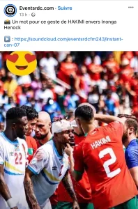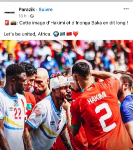 تداولت مجموعة من الصفحات الخاصة بنشر أخبار الرياضة وعدد من المنصات عبر مواقع التواصل الاجتماعية بمختلف الدول الإفريقية صورة لنجم أسود الأطلس اللاعب الدولي أشرف حكيمي وهو يقدم العون والمساعدة للاعب الكونغولي “إينونغا” عقب تعرضه لإصابة على مستوى الجبهة.