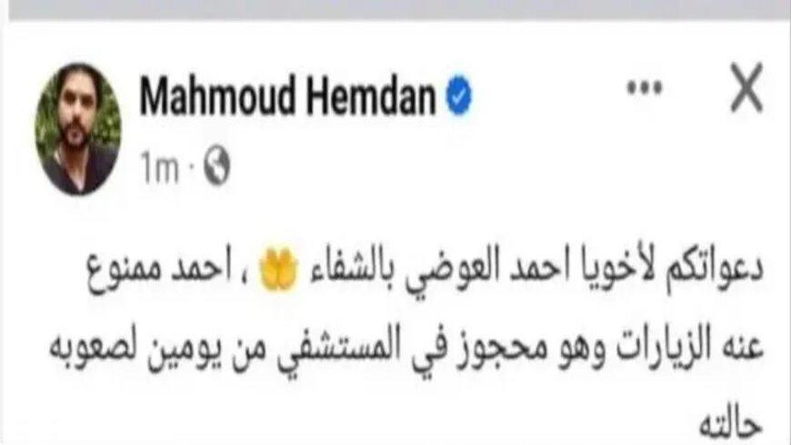 من جانبه، أعلن محمود حمدان، مؤلف مسلسل “حق عرب” من خلال منشور عبر حسابه على موقع التواصل الاجتماعي “فيسبوك”، تعرض بطل العمل أحمد العوضي لأزمة صحية وكتب: “دعواتكم لأخويا أحمد العوضي بالشفاء، أحمد ممنوع عنه الزيارات، وهو محجوز في المستشفى بقاله يومين لصعوبة حالته”، لكنه عاد وحذف المنشور وهو ما أثار