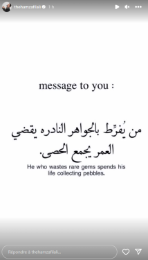 وكتب حمزة الفيلالي في التدوينة التي شاركها مع متابعيه عبر خاصية القصص القصيرة قائلا:” “رسالة لك: من يفرط بالجواهر النادرة يقضي العمر بجمع الحصى”، الأمر الذي أثار جدلا حول المقصود بهذه الرسالة.