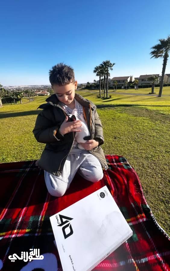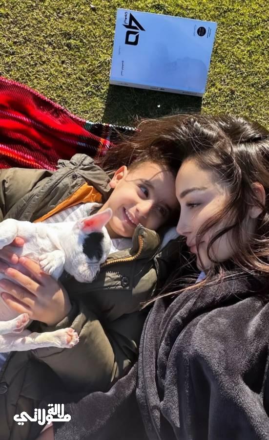 وظهر الطفل الصغير وهو يجلس معها على الأرض في أحد المنتجعات الفخمة ويرتدي ملابس كاجوال أنيقة ويلعب مع كلبه الصغير، بينما تقوم بوسيل بقراءة كتاب.