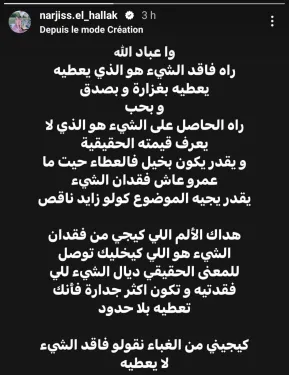 وقالت من خلال تدوينتها:” وا عباد الله، راه فاقد الشيء هو الذي يعطيه، يعطيه بغزارة و بصدق و بحب، راه الحاصل على الشيء هو الذي لا يعرف قيمته الحقيقية، ويقدر يكون بخيل فالعطاء، حيت ما عمرو عاش فقدان الشيء، يقدر يجيه الموضوع کولو زاید ناقص.