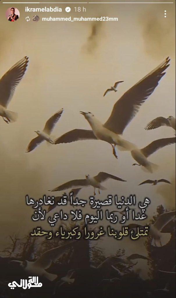 وتحتوي التدوينة التي نشرتها إكرام العبدية على ما يلي:”هي الدنيا قصيرة جداً قد نغادرها غداً أو ربما اليوم فلا داعي لأن تمتلئ قلوبنا غرورا وكبرياء وحقد”.