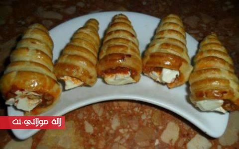نقلي البصل مع الزيت على نار هادئة ، نضيف بعدها اللحم المفروم والفلفل الاسود والملح ونقليه ،، بعدها نضيف الطماطم المفرومة والثوم وورقة سيدنا موسى ونتركهم على نار هادئة حتى تطبخ الطماطم في اناء نضيف كأسا ونصف من الماء و مركز الطماطم و تحميرة والزعيترة وورقة سيدنا موسى ونخلط جيدا ثم نضيفه إلى خليط اللحم والبصل الطماطم .. نغطي القدر ونترك الصلصة إلى أن تطهى الكـــورني : قومي ببسط العجينة المورقة ثم قطعي شرائط طويلة بلليها بالماء قليلا باصبعك ثم لفيها على الكورني ولا تنسي تثبيته جيدا في الأول حتى لا تفتح ، عندما تنتهين من لف الكورني اضغطي عليه جيدا وتدهن بالبيض وبعدها ضعيه في الصينية بحيث تكون الفتحة الأخيرة نحوالاسفل حتى لايفتح أطهيها في الفرن ثم قومي بحشوها بالصلصة وأضيفي الجبنة الفـــولـــوفون : نقوم ببسط العجينة المورقة تقريبا 4 ملم وتقطع دوائر بواسطة كأس صغير أومرشم ثم يضغط عليها في الوسط بواسطة مرشم صغير دائري الشكل أو شيئ من هذا القبيل دون أن تنفصل العجينة عن بعضها بعدها أحضري صينية وبلليها بقليل من الماء ثم ضعي فوقها ورق الزبدة {الماء يعمل رطوبة وبذلك يساعد على تورق العجينة} بعدها ضعي كل الدوائر وتدهن بالبيض وتتقب قليلا بالشوكة قومي بتسخين الفرن على درجة 200 ثم ادخليها لتطهى .. قبل الطهي قومي بوضع الحشوة والزيتون والجبن ثم ترجع إلى الفرن ليذوب الجبن وهاهو الطبق جاهز