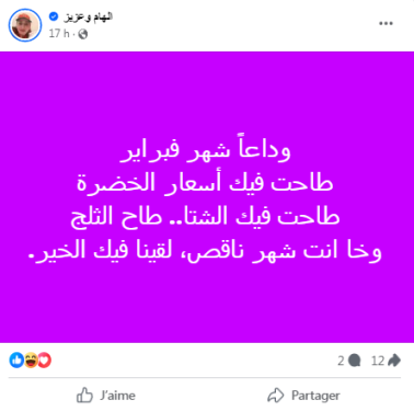 وكتبت الفنانة إلهام واعزيز في تدوينتها قائلة:”وداعا شهر فبراير، طاحت فيك أسعار الخضرة، طاحت فيك الشتا.. طاح الثلج، وخا انت شهر ناقص، لقينا فيك الخير.”
