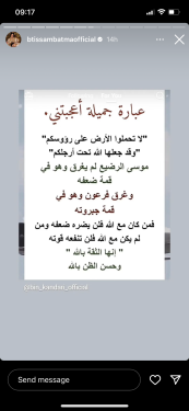 ونشرت ابتسام بطمة التدوينة عبر خاصية القصص القصيرة وقالت من خلالها:”عبارة جميلة أعجبتني، لا تحملوا الأرض على رؤوسكم” “وقد جعلها الله تحت أرجلكم” موسى الرضيع لم يغرق وهو في قمة ضعفه و غرق فرعون وهو في قمة جبروته فمن كان مع الله فلن يضره ضعفه ومن لم يكن مع الله فلن تنفعه قوته إنها الثقة بالله وحسن الظن بالله”.