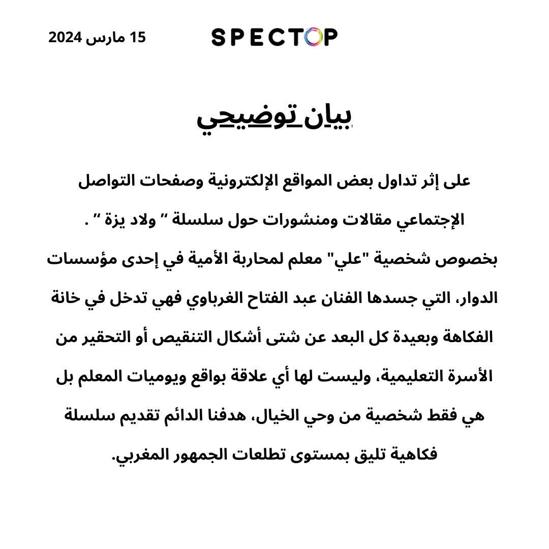 وأوضح البيان أن سلسلة “أولاد يزة” خاصة الشخصية “علي” أي معلم محاربة الأمية في الدوار التي يقوم بتجسيدها الفنان عبد الفتاح الغرباوي، لا تسيء للمعلم، بل ما تقوم به يدخل في خانة الفكاهة وبعيدا كل البعد عن شتى أشكال التنقيص أو التحقير من الأسرة التعليمية.