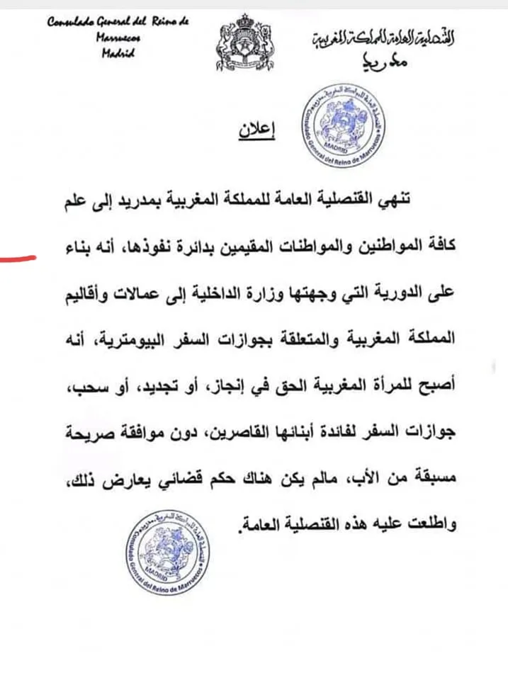وحسب إعلانات صادرة عن تمثيليات دبلوماسية للمملكة في الخارج، فإنه يمكن للمرأة المغربية إنجاز أو تجديد أو سحب جوازات السفر لفائدة أبنائها القاصرين دون موافقة صريحة مسبقة من الأب ، مالم يكن هناك حكم قضائي يعارض ذلك.