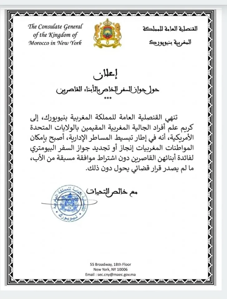 أصبح بإمكان الزوجة المغربية في الخارج و داخل أرض الوطن استخراج جواز سفر لفائدة أطفالها القاصرين دون موافقة صريحة مسبقة من الأب.