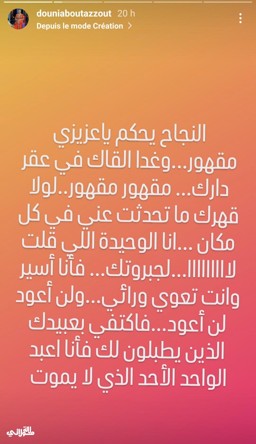 نشرت الفنانة المغربية دنيا بوطازوت عبر حسابها الرسمي على موقع تبادل الصور والفيديوهات إنستغرام، وبالضبط عبر خاصية القصص القصيرة، تدوينة شاركتها مع متابعيها وأثارت بها الجدل لما تحتويه.