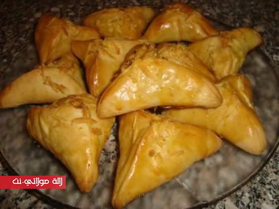 نفرد العجينة ونقطعها دوائر وكل دائرة نضع قليلا من الدجاج وفوقها الخضر وتغلق على شكل مثلث وتذهن بصفار البيض وترش بالجبن