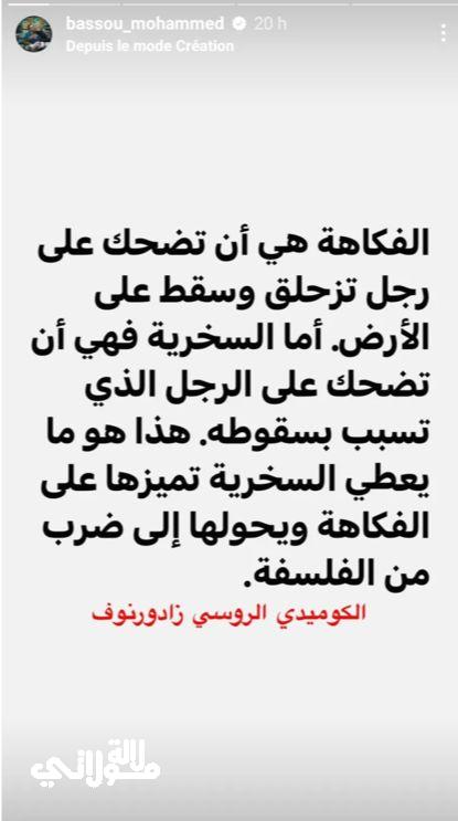 نشر الفنان الكوميدي محمد باسو عبر خاصية القصص القصيرة بحسابه الرسمي على موقع تبادل الصور والفيديوهات ” انستغرام” ، للكوميدي الروسي ميكائيل زادورنوف الساخر، يوضح من خلالها الفرق الشاسع بين الفكاهة والسخرية.
