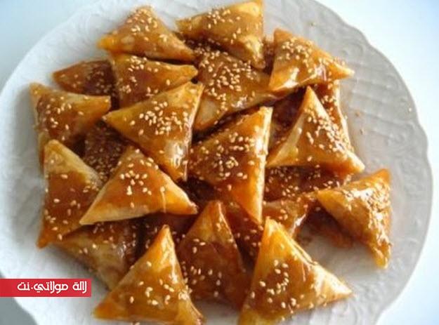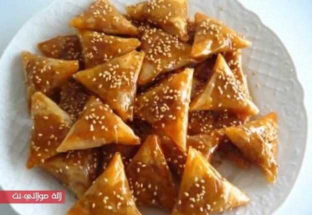 نصنع من العقدة كويرات صغيرة ثم نأخد ورقة االبسطيلة و نقسمها نصفان و نضع العقدة و نشكلها كما في الصور حتى نحصل على مثلث نغلقه بخليط الدقيق و الماء