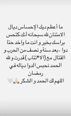 وقالت غيثة لكزولي:”ما أعظم ديك الإحساس ديال الامتنان لله سبحانه، أنك كتحس براسك بخير وانت ما واخد حتا دوا، بعد سنة ونصف من الحرب والقتال مع الاكتئاب، قدرت ولله الحمد نحبس الدوا دياله في رمضان، اللهم لك الحمد والشكر”.