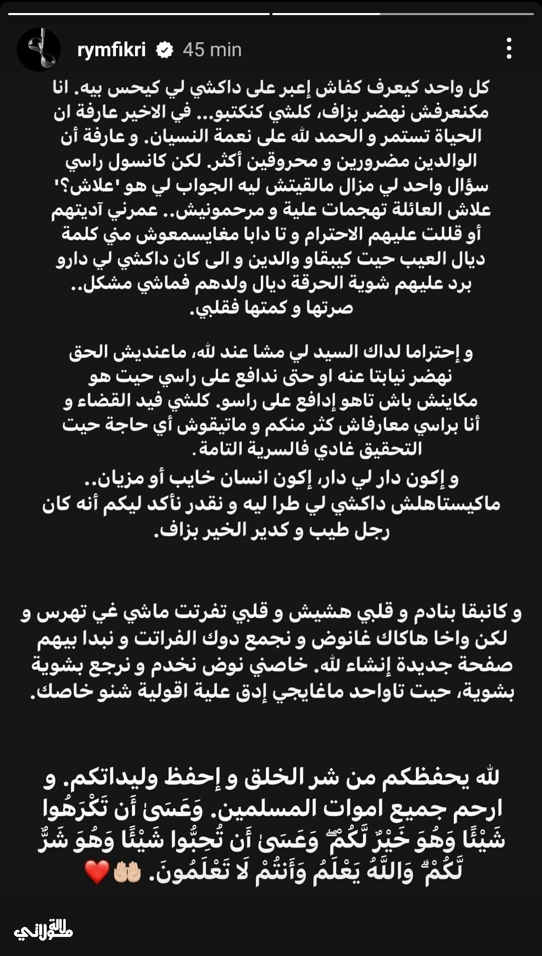 ووجهت ريم فكري كلاما قاسيا عبر تدوينتها لتضع حدا لما يتم تداوله عنها من قبل عائلة زوجها المغدور حيث كتبت في تدوينة عبر حسابها الرسمي على موقع تبادل الصور والفيديوهات إنستغرام وبالضبط عبر خاصية القصص القصيرة قائلة:”