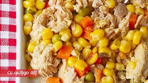 1- ضعي التونة، الذرة، البازيلاء والجزر في طبق التقديم.