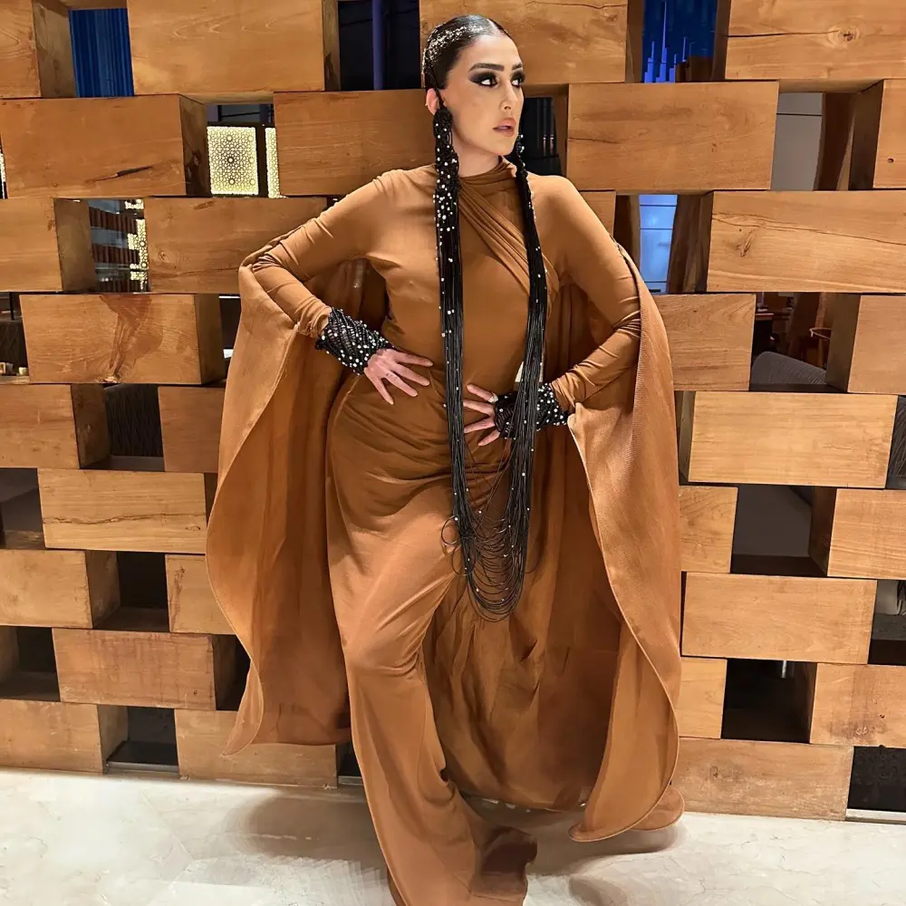 كما مع الأكمام الطويلة المجسمة، التي انسدل منها ما يشبه الوشاح الطويل الممتد حتى أسفل، والرقبة المستديرة، واستعانت غادة عبد الرازق باكسسوارات داكنة على معصميها على شكل سلاسل براقة، وأقراط طويلة للغاية انسدلت للأمام لتتصل ببعضها البعض.