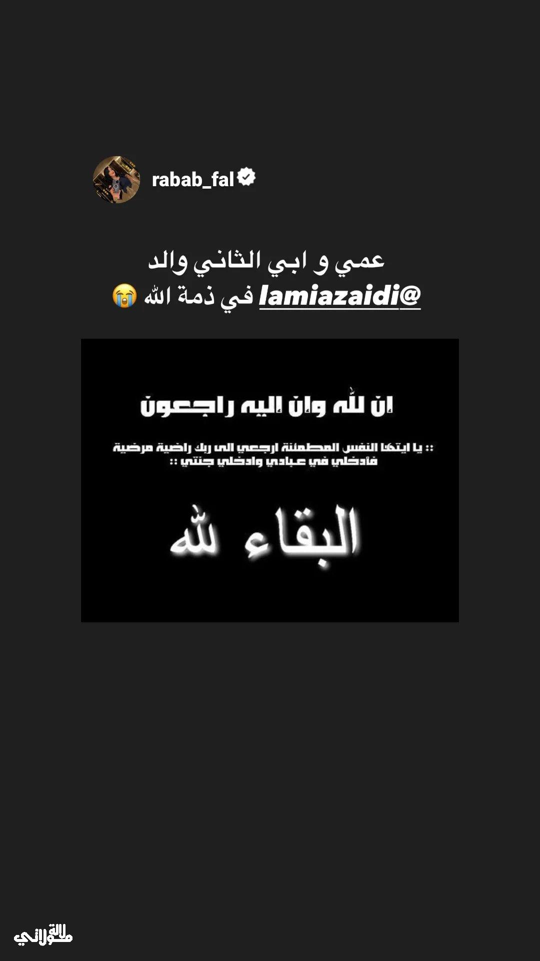 وكتبت ابنة عم الفنانة لمساء الزايدي رباب الزايدي في تدوينتها قائلة:”عمي وأبي الثاني والد لمياء الزايدي في ذمة الله..إنا لله وإنا إليه راجعون” .