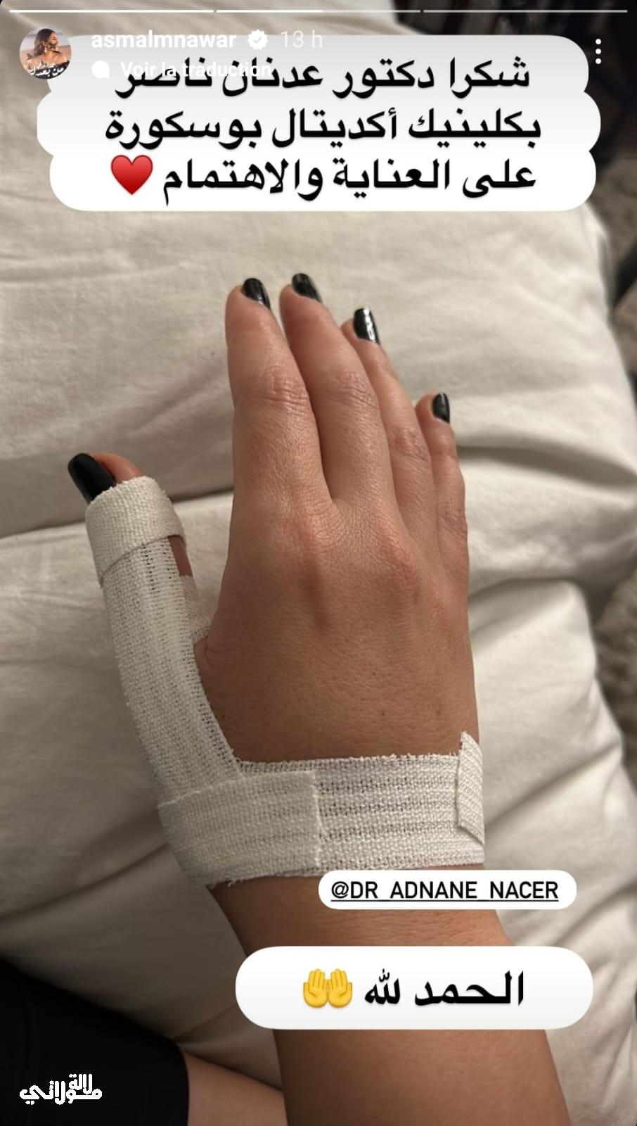 ونشرت أسماء لمنور الخبر بالضبط عبر خاصية القصص القصيرة، الصورة بتعليق نصه كالتالي: “شكرا دكتور عدنان ناصر بكلينيك أكديتال بوسكورة على العناية والاهتمام.